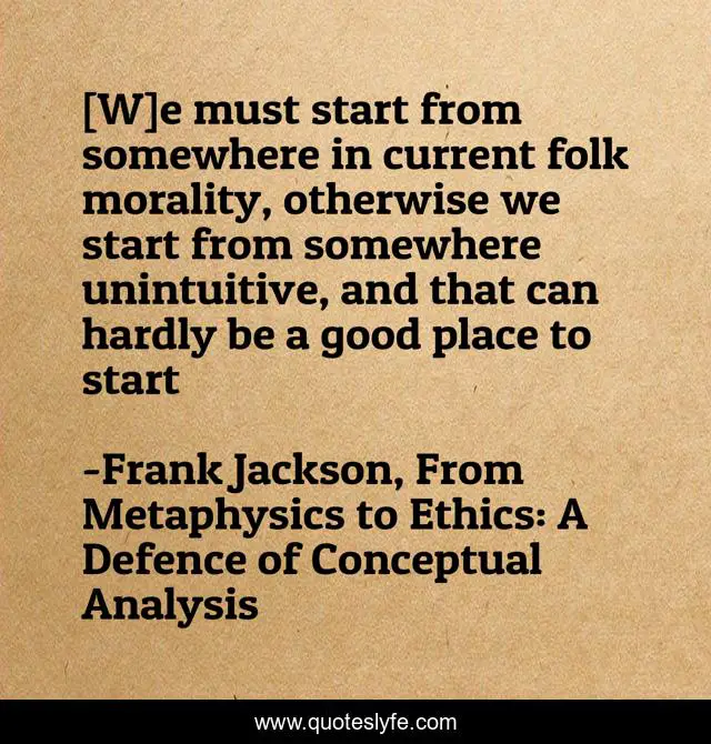 This page presents the quote "[W]e must start from somewhere in current folk morality, otherwise we start from somewhere unintuitive, and that can hardly be a good place to start". Author of this quote is Frank Jackson, From Metaphysics to Ethics: A Defence of Conceptual Analysis. This quote is about ethics, philosophy, morality,.
