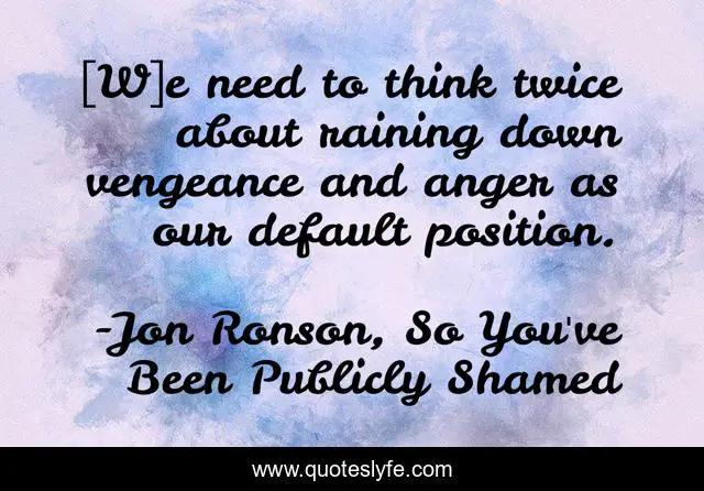 This page presents the quote "[W]e need to think twice about raining down vengeance and anger as our default position.". Author of this quote is Jon Ronson, So You've Been Publicly Shamed. This quote is about anger, default, vengeance,.