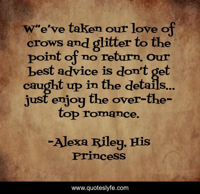 This page presents the quote "W“e’ve taken our love of crows and glitter to the point of no return. Our best advice is don’t get caught up in the details… just enjoy the over-the-top romance.". Author of this quote is Alexa Riley, His Princess. This quote is about romance, erotic-romance, hope,.