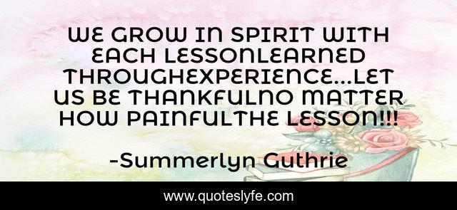 This page presents the quote "WE GROW IN SPIRIT WITH EACH LESSONLEARNED THROUGHEXPERIENCE...LET US BE THANKFULNO MATTER HOW PAINFULTHE LESSON!!!". Author of this quote is Summerlyn Guthrie. This quote is about spiritual-growth, life, life-experience, life-lesson, philosophy, spiritual, life-lessons, life-philosophy,.