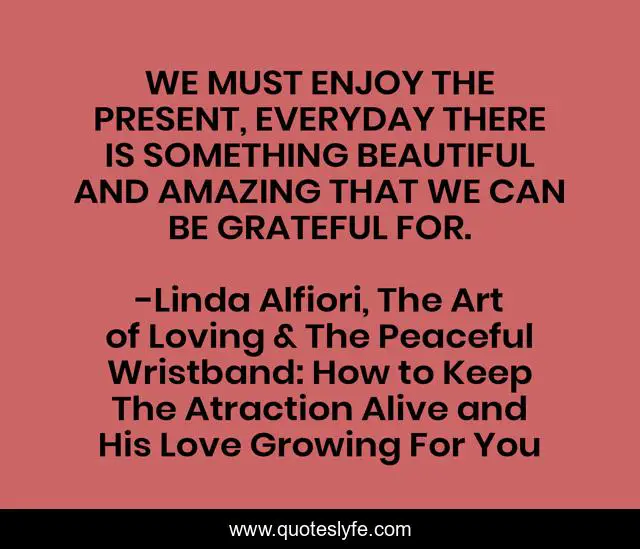 This page presents the quote "WE MUST ENJOY THE PRESENT, EVERYDAY THERE IS SOMETHING BEAUTIFUL AND AMAZING THAT WE CAN BE GRATEFUL FOR.". Author of this quote is Linda Alfiori, The Art of Loving & The Peaceful Wristband: How to Keep The Atraction Alive and His Love Growing For You. This quote is about love, marriage-advice, relationship-advice, affection, spirituality,.