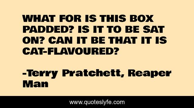 This page presents the quote "WHAT FOR IS THIS BOX PADDED? IS IT TO BE SAT ON? CAN IT BE THAT IT IS CAT-FLAVOURED?". Author of this quote is Terry Pratchett, Reaper Man. This quote is about cats, death, chocolate-box,.