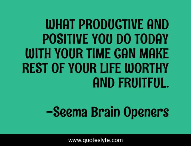 This page presents the quote "WHAT PRODUCTIVE AND POSITIVE YOU DO TODAY WITH YOUR TIME CAN MAKE REST OF YOUR LIFE WORTHY AND FRUITFUL.". Author of this quote is Seema Brain Openers. This quote is about life, motivation, success,.