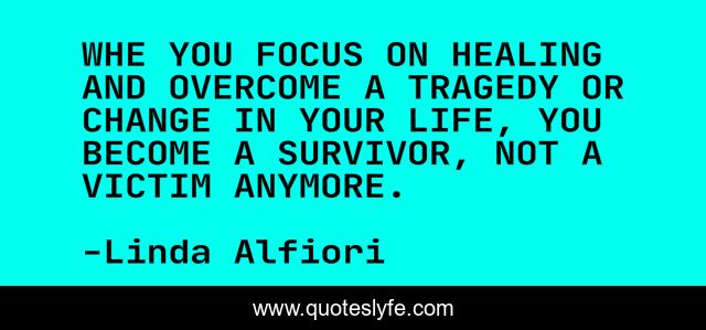 This page presents the quote "WHE YOU FOCUS ON HEALING AND OVERCOME A TRAGEDY OR CHANGE IN YOUR LIFE, YOU BECOME A SURVIVOR, NOT A VICTIM ANYMORE.". Author of this quote is Linda Alfiori. This quote is about empowering, painful-past, grief-and-loss, healing,.