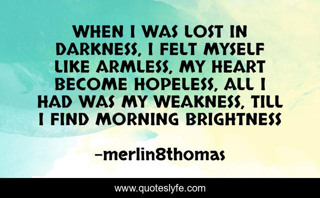 This page presents the quote "WHEN I WAS LOST IN DARKNESS, I FELT MYSELF LIKE ARMLESS, MY HEART BECOME HOPELESS, ALL I HAD WAS MY WEAKNESS, TILL I FIND MORNING BRIGHTNESS". Author of this quote is merlin8thomas. This quote is about heart, myself, armless, darkness, lost, brightness, weakness, morning,.