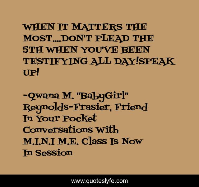 This page presents the quote "WHEN IT MATTERS THE MOST....DON'T PLEAD THE 5TH WHEN YOU'VE BEEN TESTIFYING ALL DAY!SPEAK UP!". Author of this quote is Qwana M. "BabyGirl" Reynolds-Frasier, Friend In Your Pocket Conversations With M.I.N.I M.E. Class Is Now In Session. This quote is about social-media, black-writers, yoga, hopenation, guru, writer, author, self-help, friendinyourpocket,.
