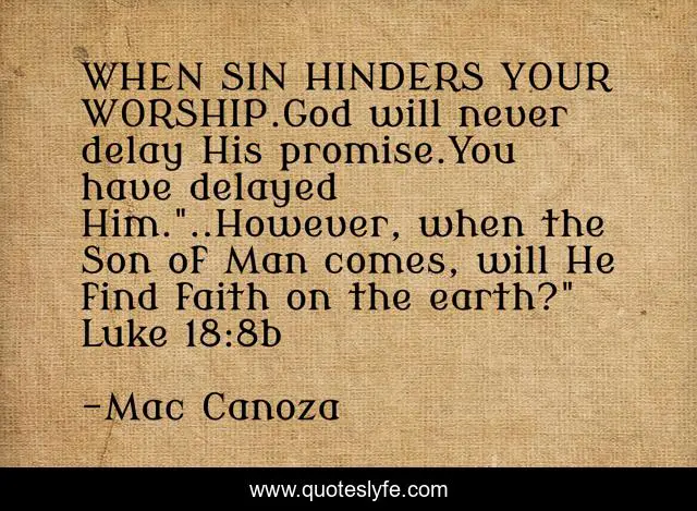 This page presents the quote "WHEN SIN HINDERS YOUR WORSHIP.God will never delay His promise.You have delayed Him."..However, when the Son of Man comes, will He find faith on the earth?" Luke 18:8b". Author of this quote is Mac Canoza. This quote is about faith, faithfulness, christianity, worship-leading, leadership, blessings, pulpit, worship-leader, church,.