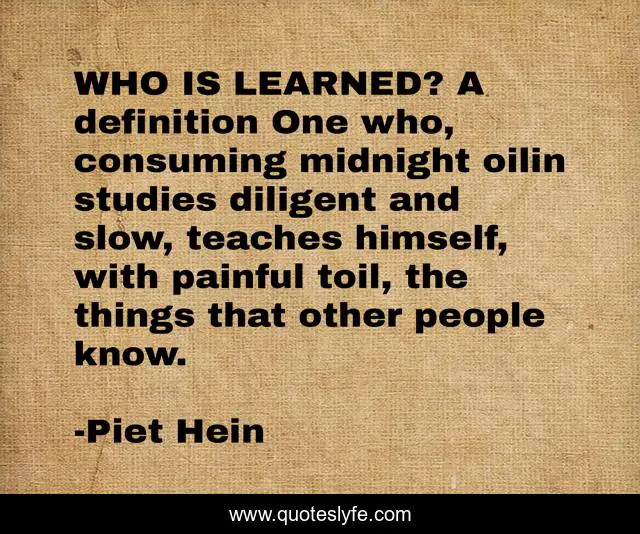 This page presents the quote "WHO IS LEARNED? A definition One who, consuming midnight oilin studies diligent and slow, teaches himself, with painful toil, the things that other people know.". Author of this quote is Piet Hein. This quote is about knowledge, studies, study, learning, learn, teaching, learned, teaches,.