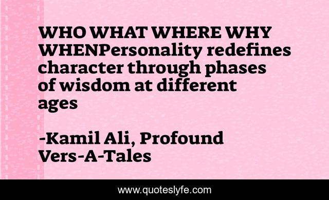 This page presents the quote "WHO WHAT WHERE WHY WHENPersonality redefines character through phases of wisdom at different ages". Author of this quote is Kamil Ali, Profound Vers-A-Tales. This quote is about kamiltheauthor, phases, kamil, ali, tales, philosophy, character, vers, wisdom,.