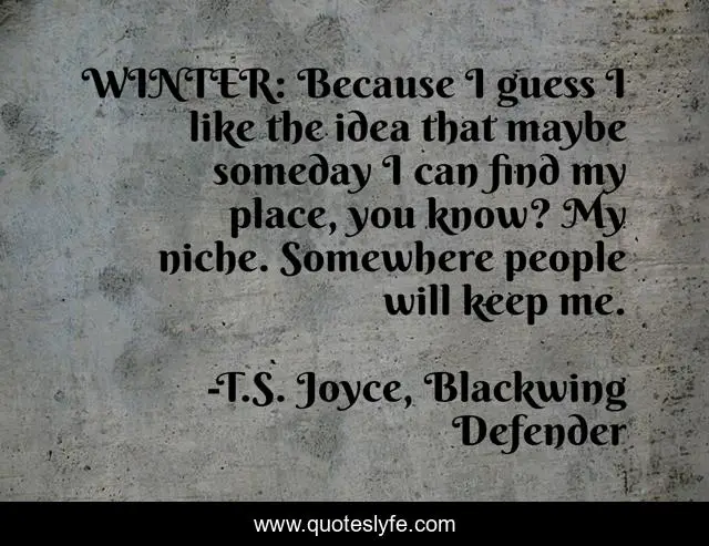 This page presents the quote "WINTER: Because I guess I like the idea that maybe someday I can find my place, you know? My niche. Somewhere people will keep me.". Author of this quote is T.S. Joyce, Blackwing Defender. This quote is about shifter-romance, self-help,.