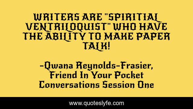 This page presents the quote "WRITERS ARE "SPIRITIAL VENTRILOQUIST" WHO HAVE THE ABILITY TO MAKE PAPER TALK!". Author of this quote is Qwana Reynolds-Frasier, Friend In Your Pocket Conversations Session One. This quote is about confidence, love, positive, motivational, college, self-improvement, inspirational, enthusiasm, affection,.