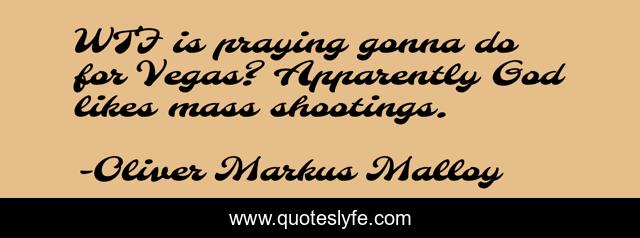 This page presents the quote "WTF is praying gonna do for Vegas? Apparently God likes mass shootings.". Author of this quote is Oliver Markus Malloy. This quote is about god, mandalay-bay, gun-violence, las-vegas-massacre, atheism, gun-control, wtf, las-vegas-shooting,.