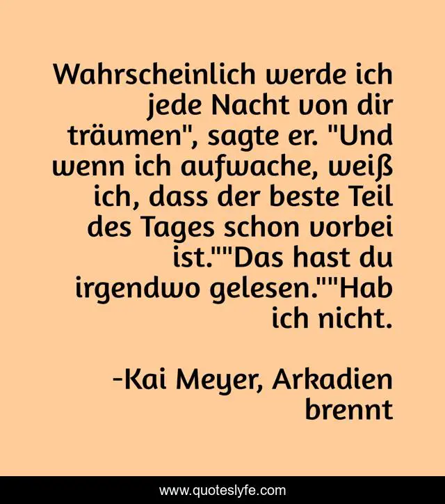 This page presents the quote "Wahrscheinlich werde ich jede Nacht von dir träumen", sagte er. "Und wenn ich aufwache, weiß ich, dass der beste Teil des Tages schon vorbei ist.""Das hast du irgendwo gelesen.""Hab ich nicht.". Author of this quote is Kai Meyer, Arkadien brennt. This quote is about romance, books, love, affection,.