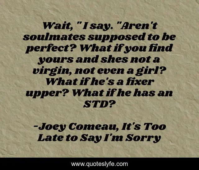 This page presents the quote "Wait, " I say. "Aren't soulmates supposed to be perfect? What if you find yours and shes not a virgin, not even a girl? What if he's a fixer upper? What if he has an STD?". Author of this quote is Joey Comeau, It's Too Late to Say I'm Sorry. This quote is about perfect, soulmates, sad,.