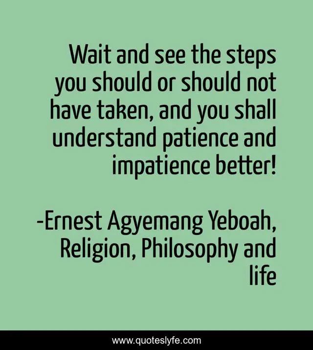 This page presents the quote "Wait and see the steps you should or should not have taken, and you shall understand patience and impatience better!". Author of this quote is Ernest Agyemang Yeboah, Religion, Philosophy and life. This quote is about wise-words, decisiveness, impatience, patience-and-timing, decision-making, steps-in-life,.