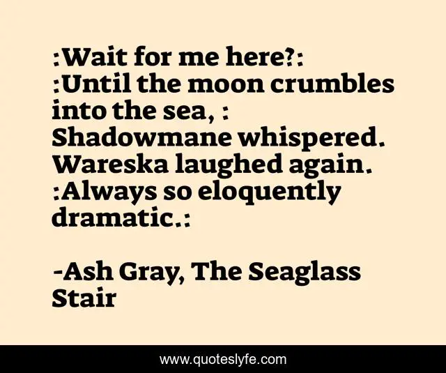 This page presents the quote ":Wait for me here?: :Until the moon crumbles into the sea, : Shadowmane whispered. Wareska laughed again. :Always so eloquently dramatic.:". Author of this quote is Ash Gray, The Seaglass Stair. This quote is about love, fantasy-fiction, affection,.