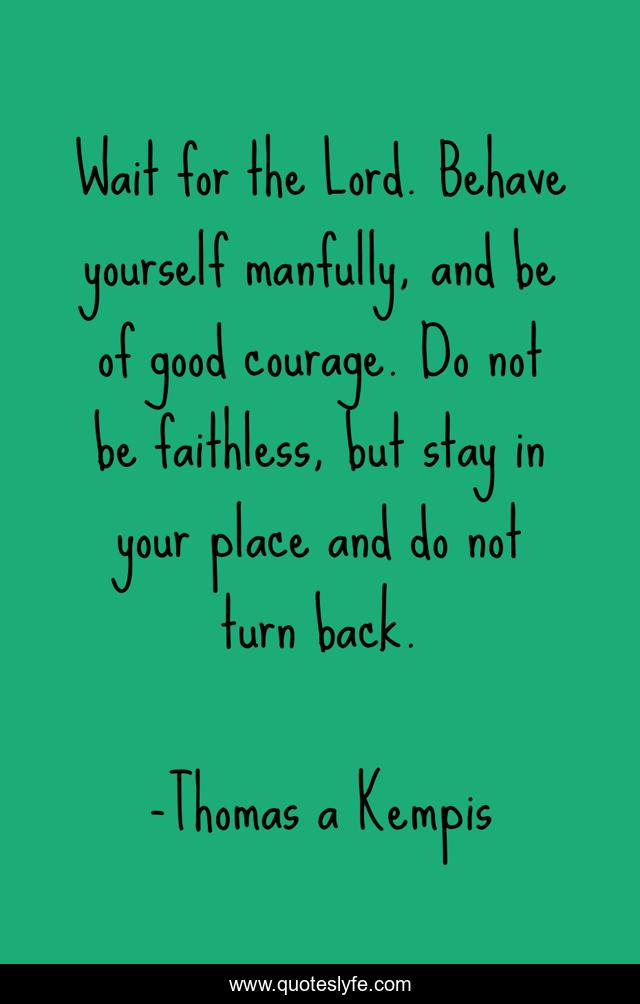 This page presents the quote "Wait for the Lord. Behave yourself manfully, and be of good courage. Do not be faithless, but stay in your place and do not turn back.". Author of this quote is Thomas a Kempis. This quote is about good, place, yourself,.