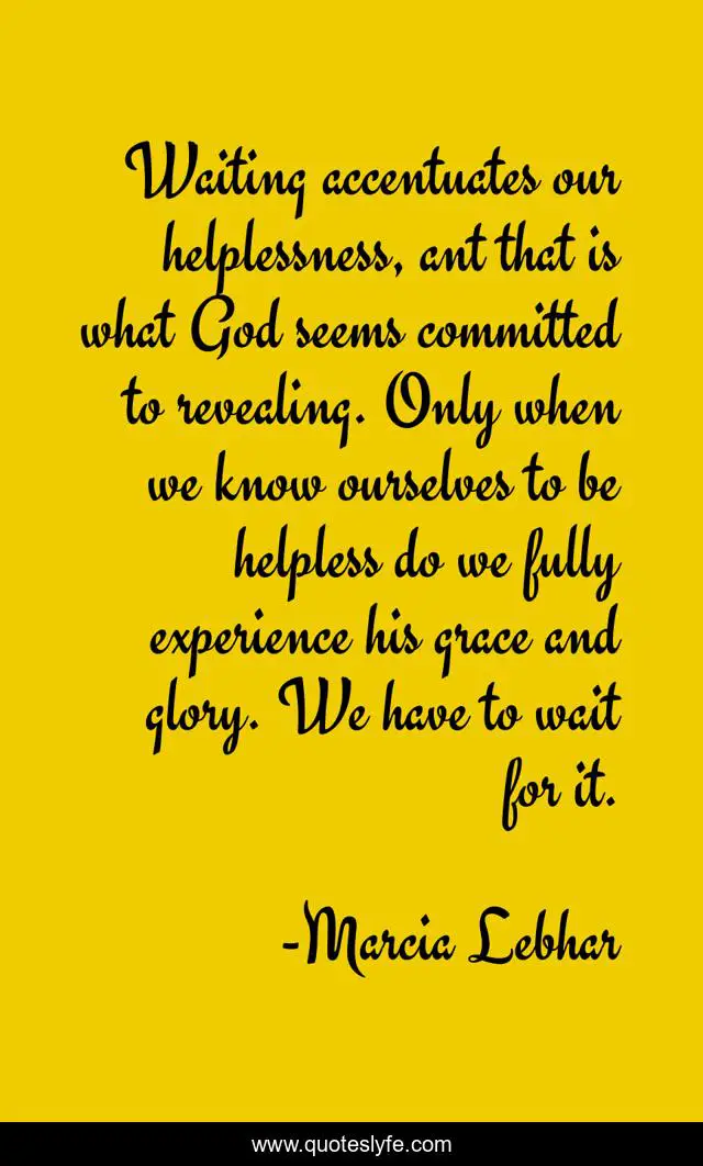 This page presents the quote "Waiting accentuates our helplessness, ant that is what God seems committed to revealing. Only when we know ourselves to be helpless do we fully experience his grace and glory. We have to wait for it.". Author of this quote is Marcia Lebhar. This quote is about god, waiting, helplessness, grace, glory,.