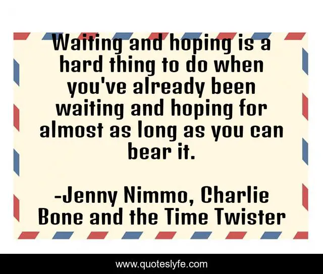 This page presents the quote "Waiting and hoping is a hard thing to do when you've already been waiting and hoping for almost as long as you can bear it.". Author of this quote is Jenny Nimmo, Charlie Bone and the Time Twister. .