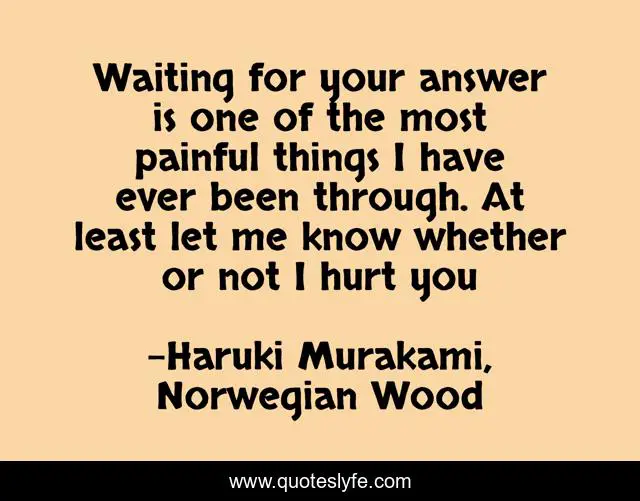 This page presents the quote "Waiting for your answer is one of the most painful things I have ever been through. At least let me know whether or not I hurt you". Author of this quote is Haruki Murakami, Norwegian Wood. This quote is about books, book, norwegian-wood,.