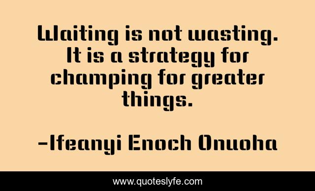 This page presents the quote "Waiting is not wasting. It is a strategy for champing for greater things.". Author of this quote is Ifeanyi Enoch Onuoha. This quote is about success, endurance, ifeanyi-enoch-onuoha, strategy, patience, waiting,.