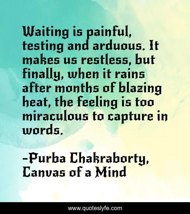 "Purba Chakraborty, Canvas of a Mind Quotes." Quoteslyfe.com, 2025. Fri. 05 Dec. 2025. <https://www.quoteslyfe.com/quote/Waiting-is-painful-testing-and-arduous-It-35432>.