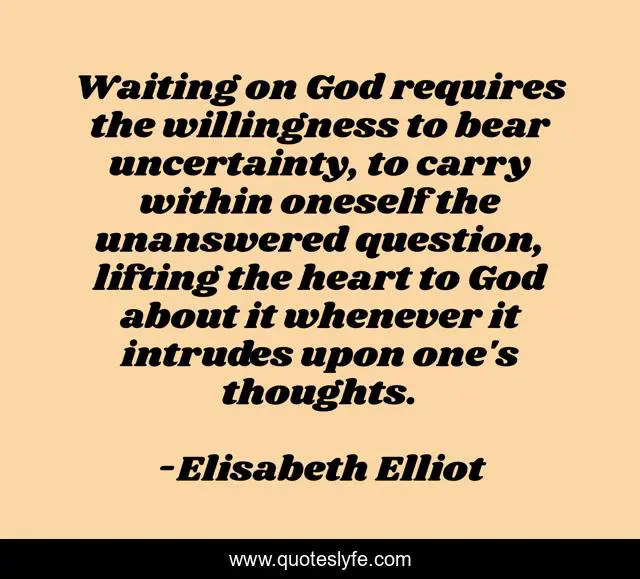 This page presents the quote "Waiting on God requires the willingness to bear uncertainty, to carry within oneself the unanswered question, lifting the heart to God about it whenever it intrudes upon one's thoughts.". Author of this quote is Elisabeth Elliot. This quote is about waiting, elliot,.