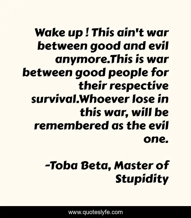 This page presents the quote "Wake up ! This ain't war between good and evil anymore.This is war between good people for their respective survival.Whoever lose in this war, will be remembered as the evil one.". Author of this quote is Toba Beta, Master of Stupidity. This quote is about evil, loser, power,.