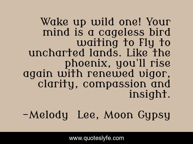 This page presents the quote "Wake up wild one! Your mind is a cageless bird waiting to fly to uncharted lands. Like the phoenix, you'll rise again with renewed vigor, clarity, compassion and insight.". Author of this quote is Melody Lee, Moon Gypsy. This quote is about fly, phoenix, compassion, insight, poetry, wild, bird,.