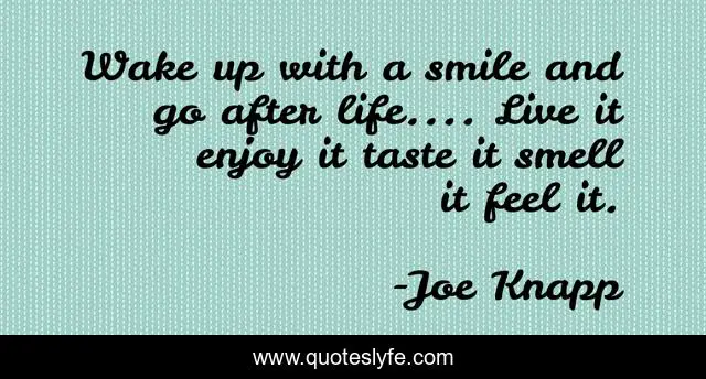 This page presents the quote "Wake up with a smile and go after life.... Live it enjoy it taste it smell it feel it.". Author of this quote is Joe Knapp. .