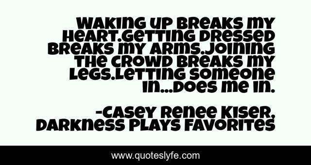 This page presents the quote "Waking up breaks my heart.Getting dressed breaks my arms.Joining the crowd breaks my legs.Letting someone in...does me in.". Author of this quote is Casey Renee Kiser, Darkness Plays Favorites. This quote is about severe-depression, gloom, melancholy, suicide, suicidal, darkness, confessional, brutal-honesty, desolation,.