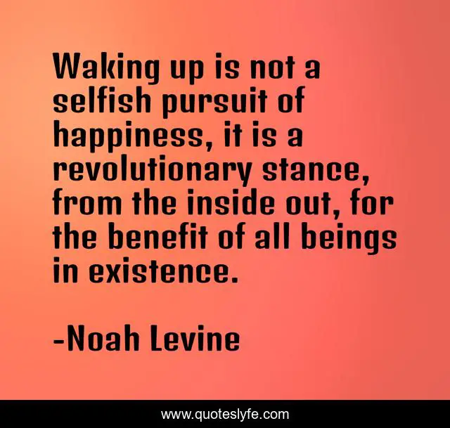 This page presents the quote "Waking up is not a selfish pursuit of happiness, it is a revolutionary stance, from the inside out, for the benefit of all beings in existence.". Author of this quote is Noah Levine. This quote is about compassion, god, life, awareness,.