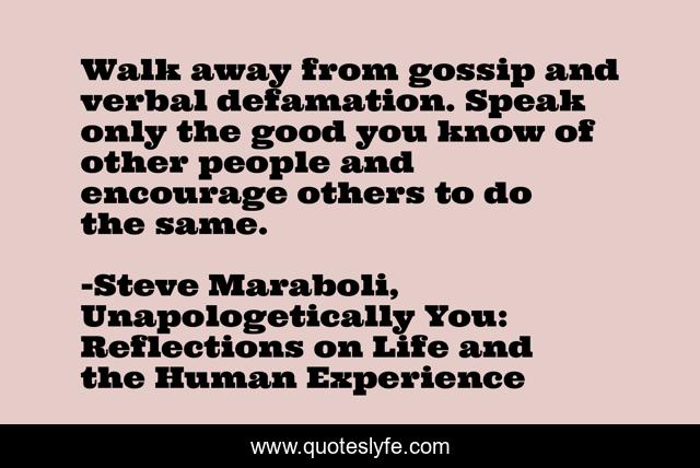 This page presents the quote "Walk away from gossip and verbal defamation. Speak only the good you know of other people and encourage others to do the same.". Author of this quote is Steve Maraboli, Unapologetically You: Reflections on Life and the Human Experience. This quote is about defamation, gossip, life, encouragement, happiness,.