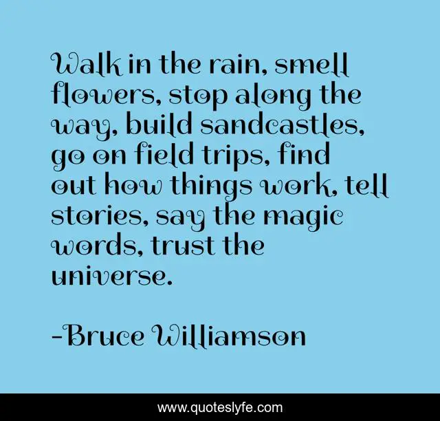 This page presents the quote "Walk in the rain, smell flowers, stop along the way, build sandcastles, go on field trips, find out how things work, tell stories, say the magic words, trust the universe.". Author of this quote is Bruce Williamson. This quote is about universe, life,.