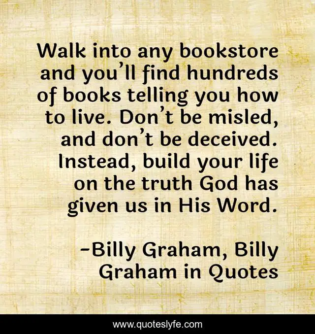 This page presents the quote "Walk into any bookstore and you’ll find hundreds of books telling you how to live. Don’t be misled, and don’t be deceived. Instead, build your life on the truth God has given us in His Word.". Author of this quote is Billy Graham, Billy Graham in Quotes. This quote is about life, billy-graham,.