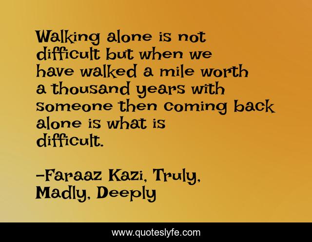 This page presents the quote "Walking alone is not difficult but when we have walked a mile worth a thousand years with someone then coming back alone is what is difficult.". Author of this quote is Faraaz Kazi, Truly, Madly, Deeply. This quote is about love, moving-on-and-letting-go, loneliness, solitude, sad, romance, tragic, sad-love, sad-but-true,.