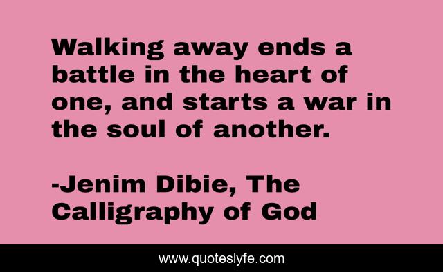 This page presents the quote "Walking away ends a battle in the heart of one, and starts a war in the soul of another.". Author of this quote is Jenim Dibie, The Calligraphy of God. This quote is about life, love, jenim-dibie, poetry, quotes, heartbreak, art, affection,.