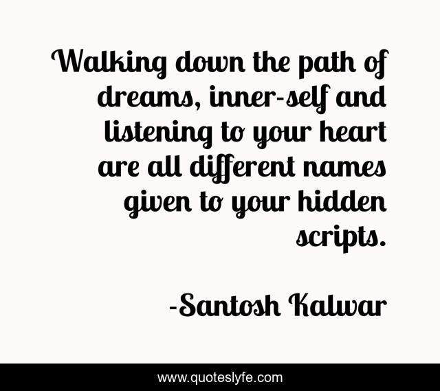This page presents the quote "Walking down the path of dreams, inner-self and listening to your heart are all different names given to your hidden scripts.". Author of this quote is Santosh Kalwar. This quote is about enthusiasm, dreams, inspirational,.