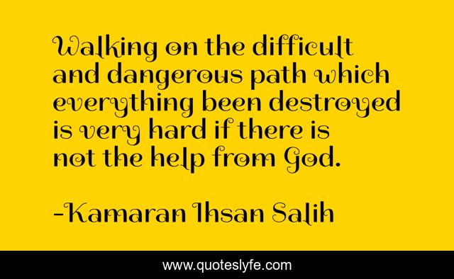 This page presents the quote "Walking on the difficult and dangerous path which everything been destroyed is very hard if there is not the help from God.". Author of this quote is Kamaran Ihsan Salih. This quote is about proverbs, phylosophical, religion-spirituality, religion, islamic, religion-and-philoshophy, islamism, phylosophy, religious,.