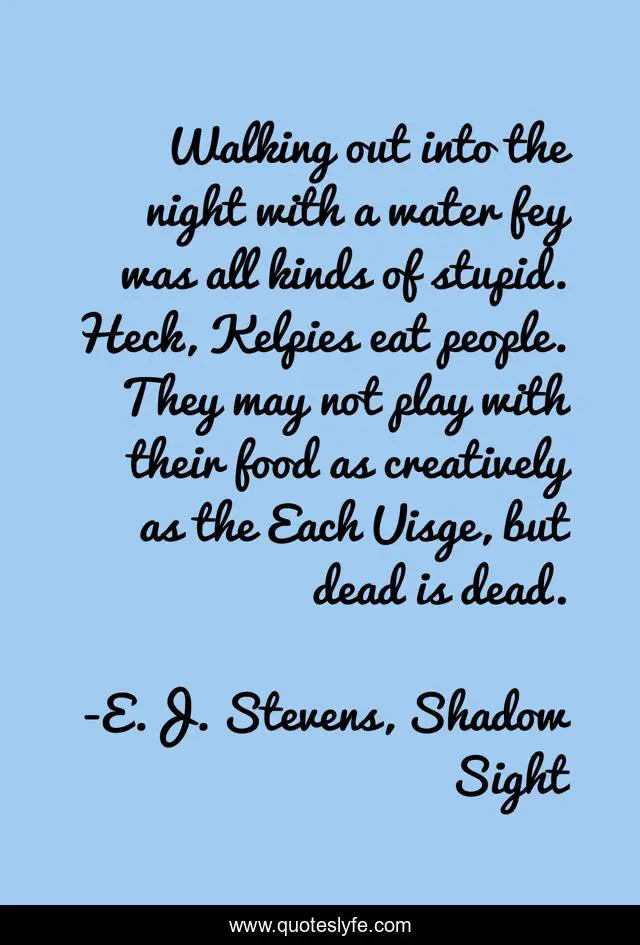 This page presents the quote "Walking out into the night with a water fey was all kinds of stupid. Heck, Kelpies eat people. They may not play with their food as creatively as the Each Uisge, but dead is dead.". Author of this quote is E.J. Stevens, Shadow Sight. This quote is about psychic-detective, urban-fantasy, paranormal, fiction, fantasy, urban-fantasy-series, kelpies, fae,.
