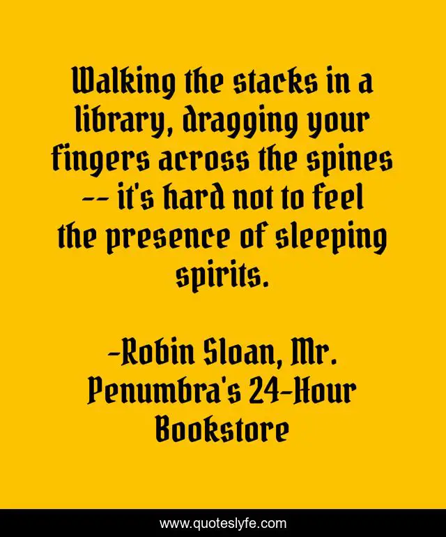 This page presents the quote "Walking the stacks in a library, dragging your fingers across the spines -- it's hard not to feel the presence of sleeping spirits.". Author of this quote is Robin Sloan, Mr. Penumbra's 24-Hour Bookstore. This quote is about libraries, books,.