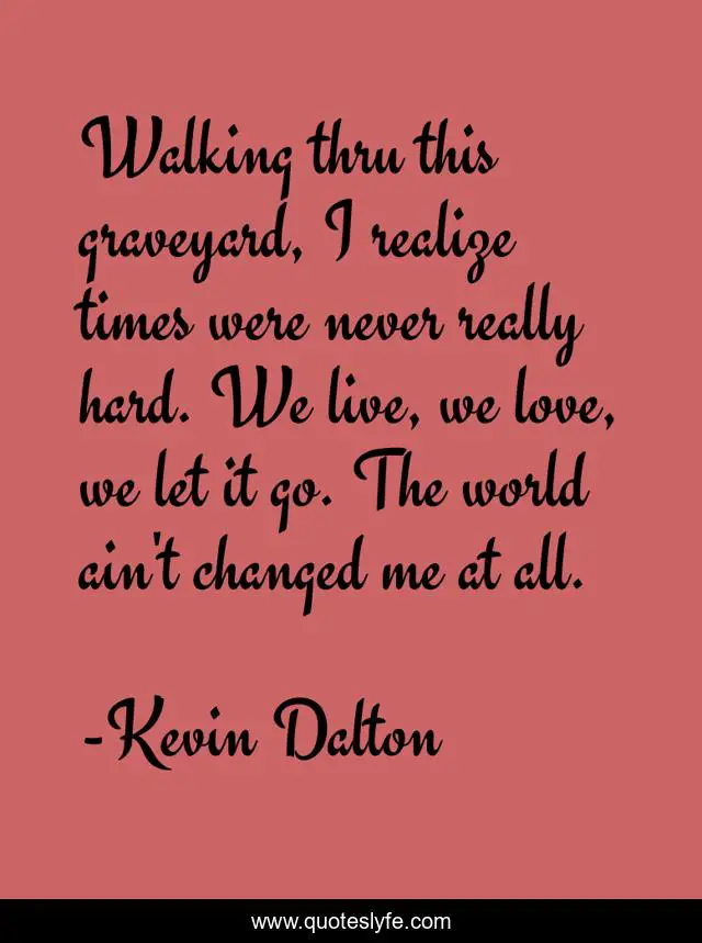 This page presents the quote "Walking thru this graveyard, I realize times were never really hard. We live, we love, we let it go. The world ain't changed me at all.". Author of this quote is Kevin Dalton. This quote is about enthusiasm, life, death, inspirational, music-lyrics,.