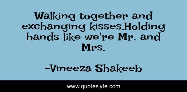 This page presents the quote "Walking together and exchanging kisses.Holding hands like we're Mr. and Mrs.". Author of this quote is Vineeza Shakeeb. This quote is about lovers, love, lovers-walk, affection,.