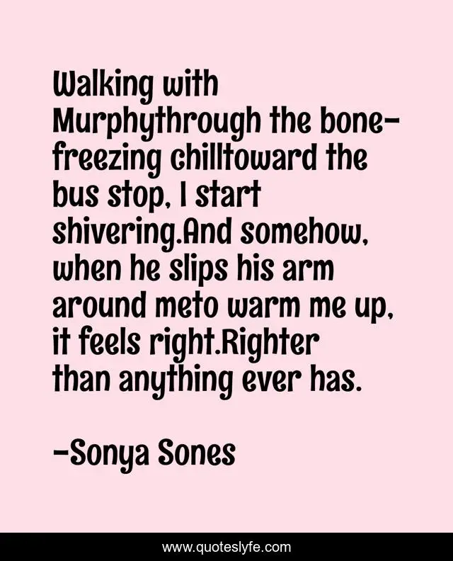 This page presents the quote "Walking with Murphythrough the bone-freezing chilltoward the bus stop, I start shivering.And somehow, when he slips his arm around meto warm me up, it feels right.Righter than anything ever has.". Author of this quote is Sonya Sones. This quote is about romantic, what-my-mother-doesn-t-know,.