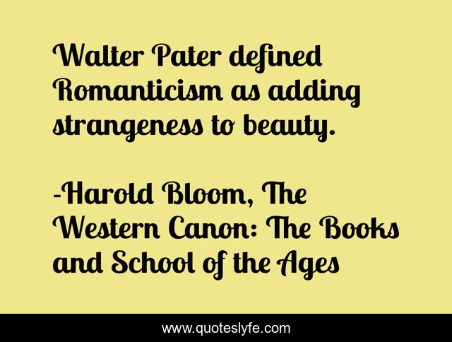 This page presents the quote "Walter Pater defined Romanticism as adding strangeness to beauty.". Author of this quote is Harold Bloom, The Western Canon: The Books and School of the Ages. This quote is about distinctiveness, communication, style, openness,.