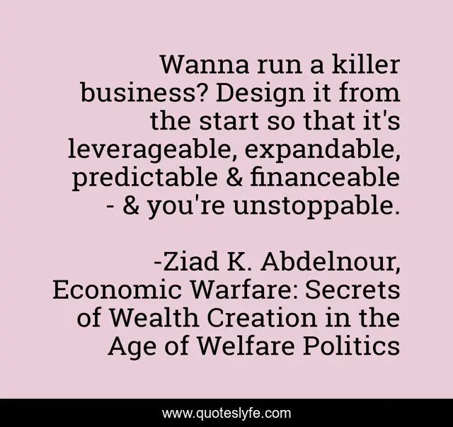 This page presents the quote "Wanna run a killer business? Design it from the start so that it's leverageable, expandable, predictable & financeable - & you're unstoppable.". Author of this quote is Ziad K. Abdelnour, Economic Warfare: Secrets of Wealth Creation in the Age of Welfare Politics. .