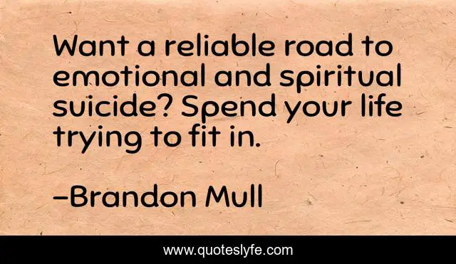 This page presents the quote "Want a reliable road to emotional and spiritual suicide? Spend your life trying to fit in.". Author of this quote is Brandon Mull. This quote is about fitting-in, advice, health, life,.
