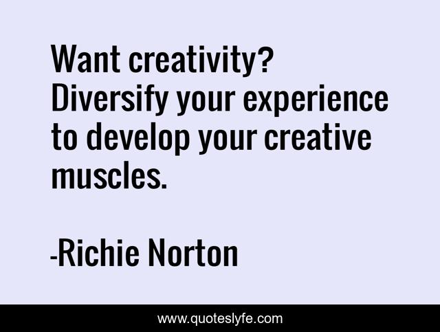 This page presents the quote "Want creativity? Diversify your experience to develop your creative muscles.". Author of this quote is Richie Norton. This quote is about productivity, creativity, experience, richie-norton, creative-business, diversity, change-management,.