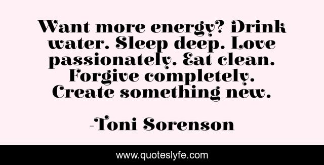 This page presents the quote "Want more energy? Drink water. Sleep deep. Love passionately. Eat clean. Forgive completely. Create something new.". Author of this quote is Toni Sorenson. This quote is about energy, life, healing,.