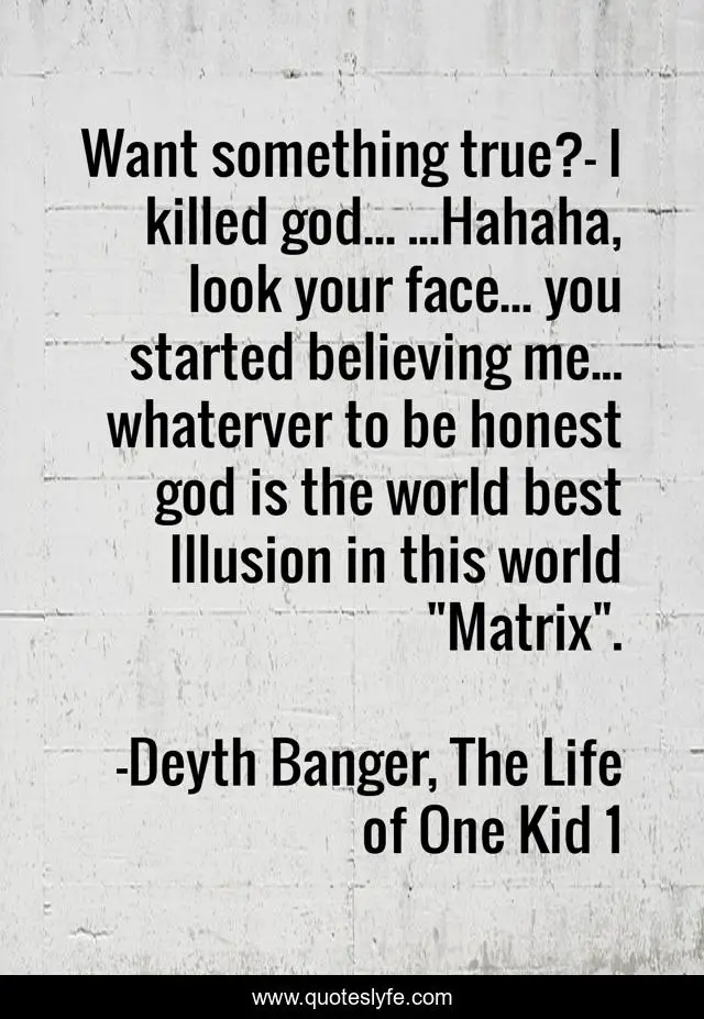This page presents the quote "Want something true?- I killed god... ...Hahaha, look your face... you started believing me... whaterver to be honest god is the world best Illusion in this world "Matrix".". Author of this quote is Deyth Banger, The Life of One Kid 1. This quote is about started, illusion, best, face,.